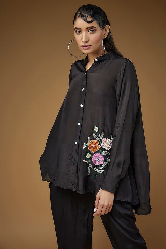 Women's Black Pure Habutai Silk Embroidered Co-Ord Set By Room9 The Popup Store