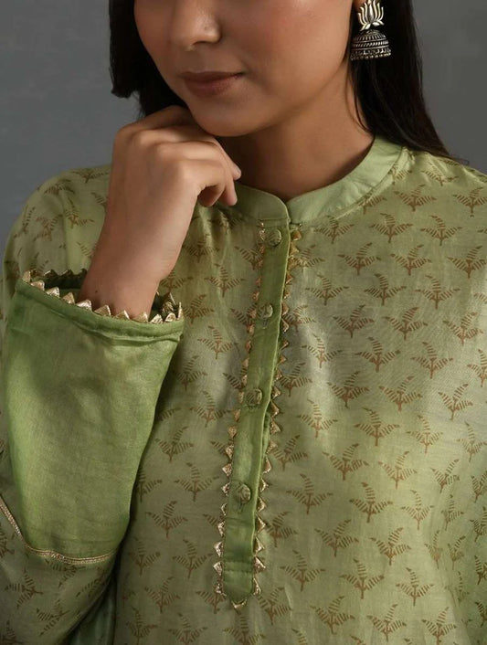 Women's Green Block Printed Handwoven Chanderi Kurta By Room9 The Popup Store