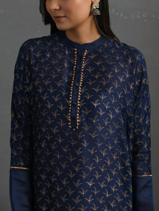 Women's Indigo Block Printed Handwoven Chanderi Kurta By Room9 The Popup Store