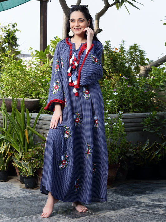Women's Navy Check Embroidered Long Dress By Room9 The Popup Store