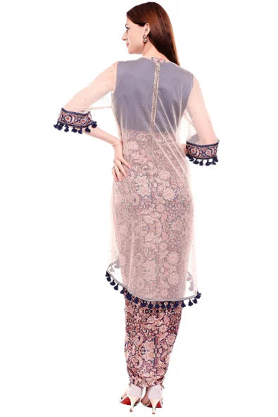 Women's Madhubani Printed Panelled Dress With Side Cuts Paired With Offwhite Net Cape By Room9 The Popup Store