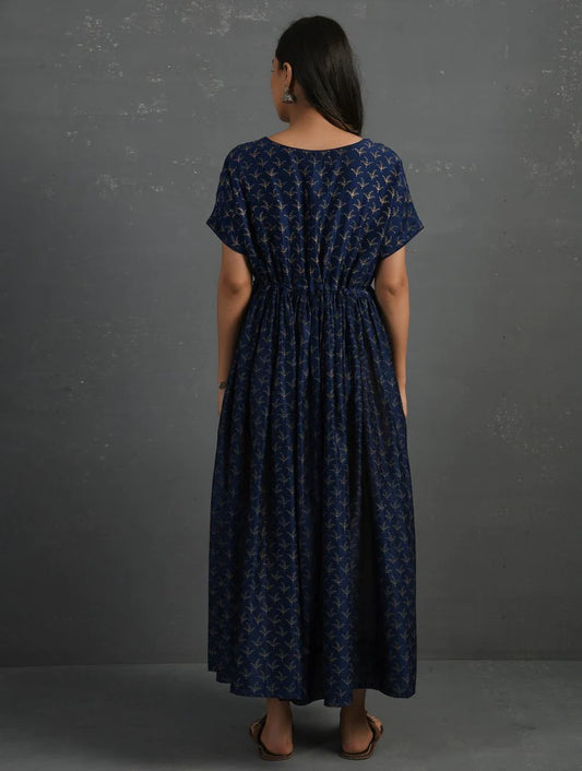 Women's Indigo Block Printed Handwoven Chanderi Maxi Dress By Room9 The Popup Store