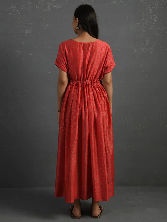 Women's Pink Block Printed Handwoven Chanderi Maxi Dress By Room9 The Popup Store