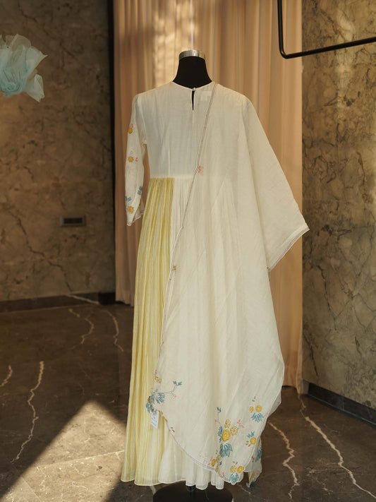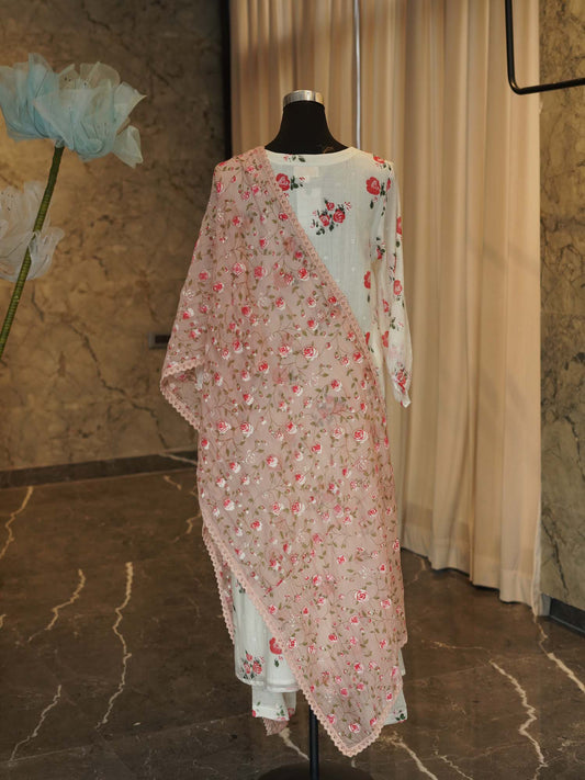 Women's Blossom Waltz: White Floral Embroidered Ensemble with Dupatta By Room9 The Popup Store