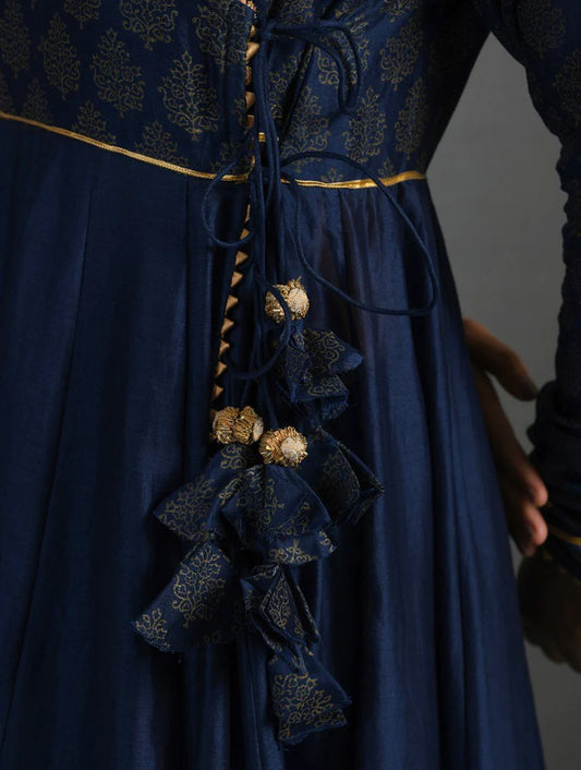 Women's Indigo Block Printed Handwoven Chanderi Kurta with Mul Slip & Pants (Set of 3) By Room9 The Popup Store