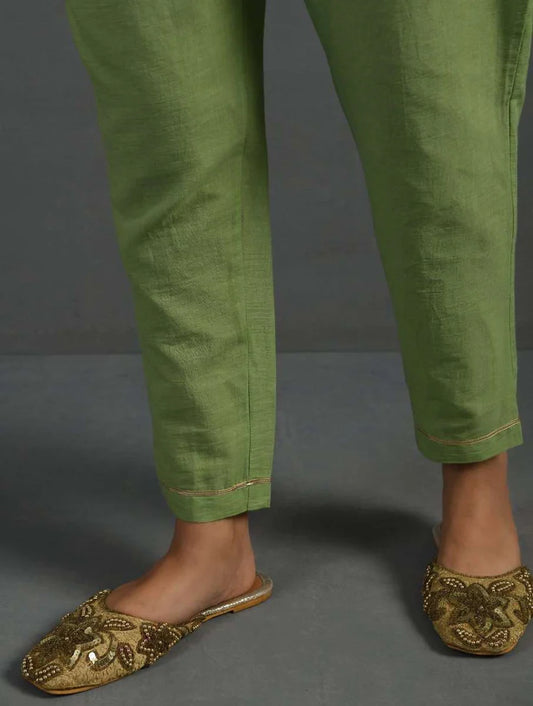 Women's Green Block Printed Handwoven Chanderi Kurta With Pants (Set of 2) By Room9 The Popup Store