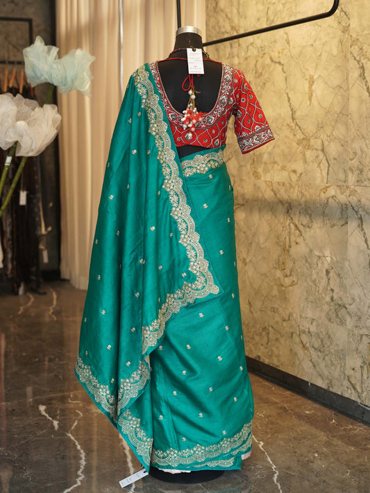 Women's Royal Green Embroidered Silk Saree By Room9 The Popup Store