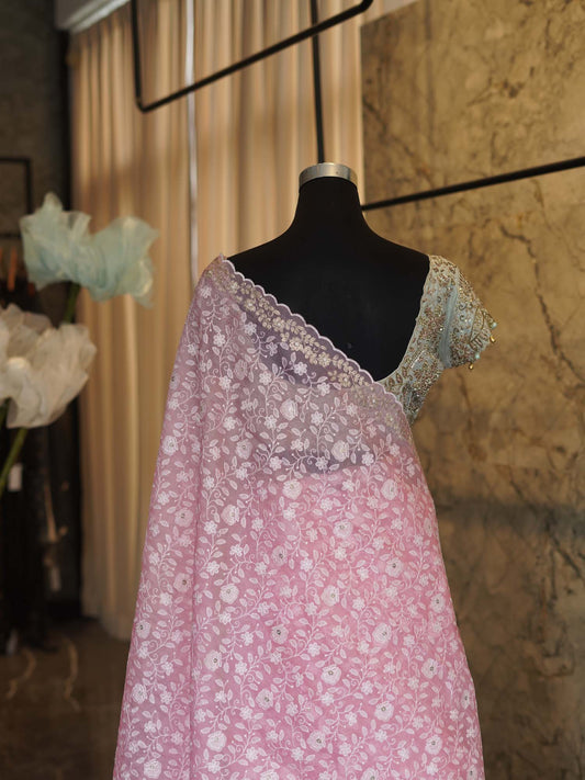 Women's Pink Petal Charisma: Georgette Chikankari Sari with Allover Embroidery By Room9 The Popup Store