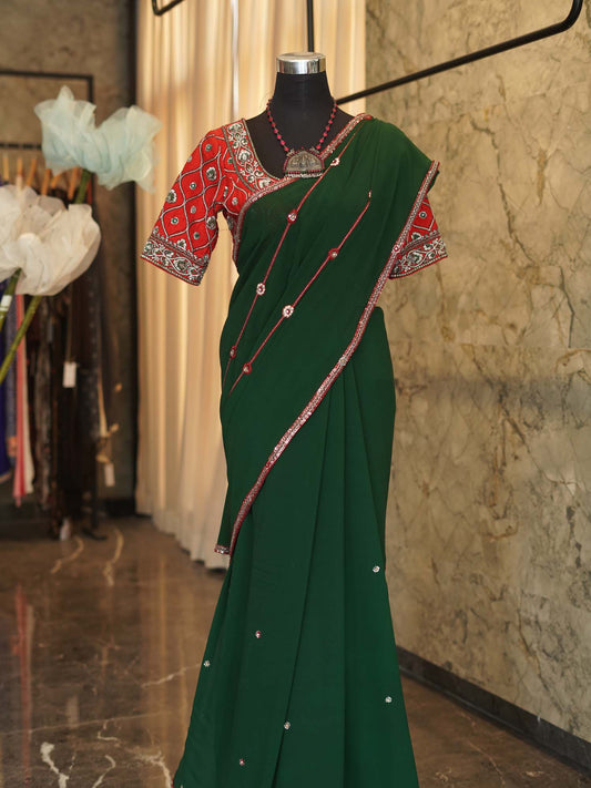 Women's Scarlet Fern Drift: Green Georgette Saree with Crimson Embroidery By Room9 The Popup Store