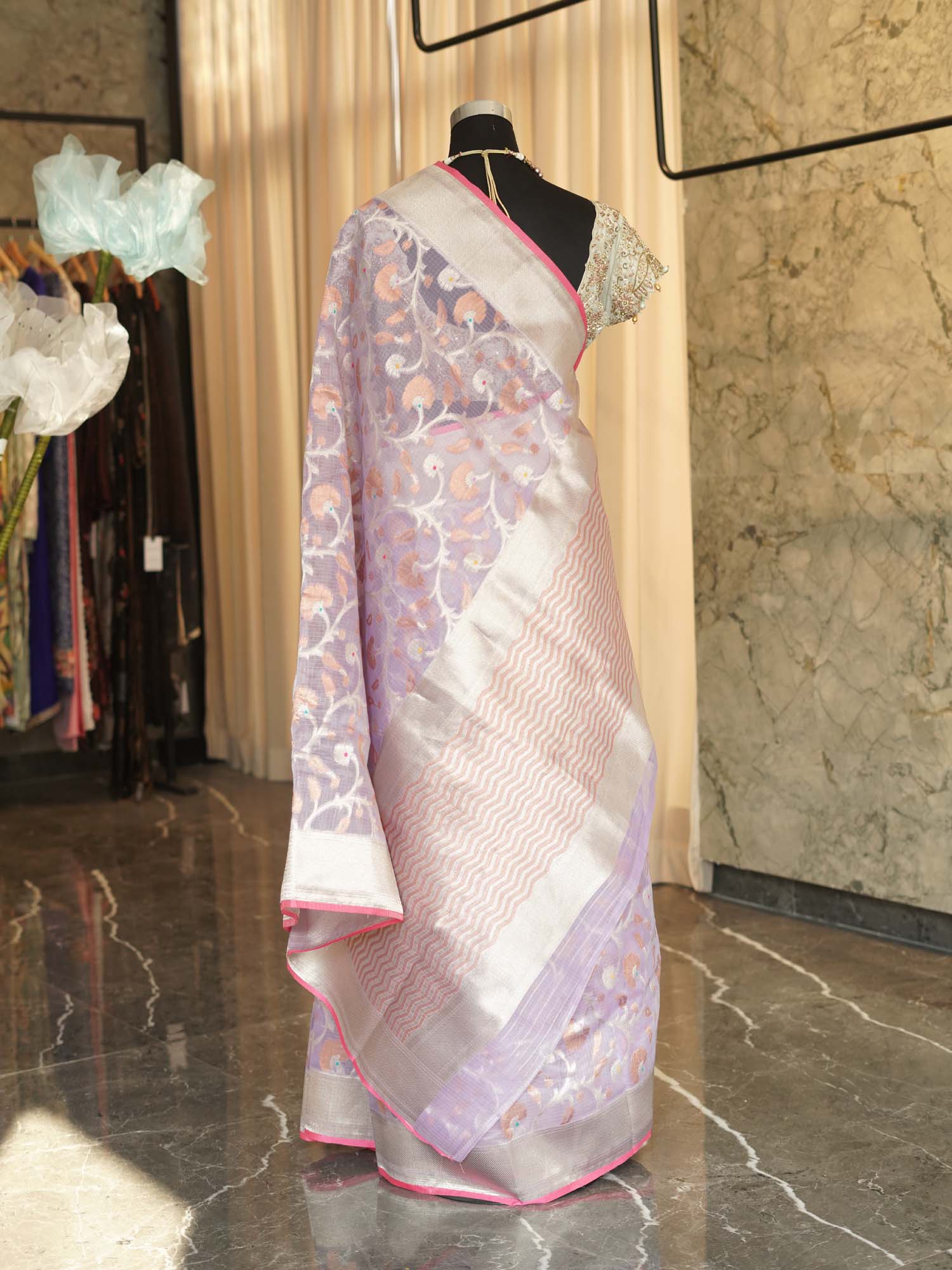 Introducing "Zari Blooms Royale," a breathtaking purple Kota saree that seamlessly marries tradition and allure. Adorned with exquisite zari work, this masterpiece captures the essence of regality. The intricate patterns, reminiscent of blooming flowers, create a visual symphony on the delicate Kota fabric. The saree comes complete with a running blouse piece in perfect harmony, ensuring a cohesive and captivating ensemble. Draped in "Zari Blooms Royale," embrace the opulence of zari detailing, exuding sophistication and grace. Perfect for special occasions, this saree is a celebration of timeless elegance and floral-inspired charm, promising a truly majestic presence.